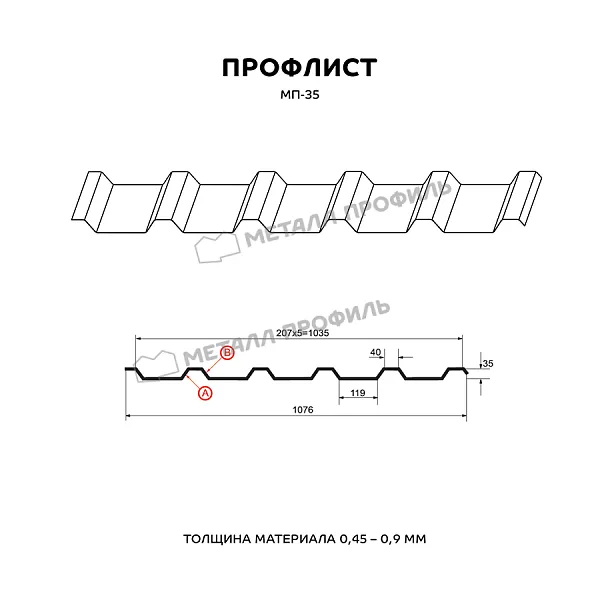 Профлист МЕТАЛЛ ПРОФИЛЬ МП-35x1035-B (VikingMP E-20-3005-0,5) широко применяется для обустройства профилированного листа. Изначально он представляет собой металлический оцинкованный лист с покрытием. Общая толщина металла с цинковым и защитно-декоративным покрытием составляет 0.5 мм.После проката на специальном оборудовании сталь приобретает рисунок из ритмичных волн. Такая форма придает профилю жёсткость.Профиль МП-35: