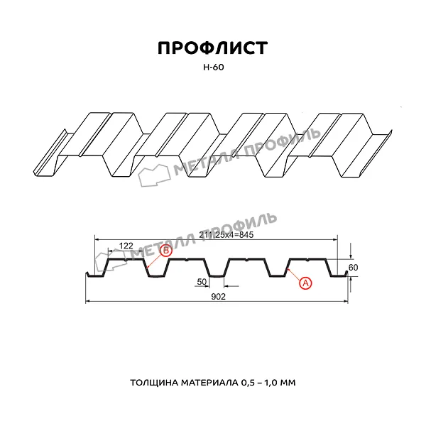 Профлист МЕТАЛЛ ПРОФИЛЬ Н-60x845-A (PURMAN-20-6005-0,5) широко применяется для обустройства профилированного листа. Представляет собой металлический оцинкованный лист с покрытием. Толщина стальной основы с оцинковкой и декоративно-защитным слоем составляет 0.5 мм. Проходя процедуру холодного проката, металл принимает волнообразный вид. Жёсткость такого листа гораздо выше плоского.