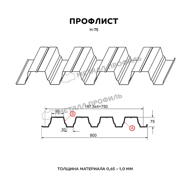 Профлист МЕТАЛЛ ПРОФИЛЬ Н-75x750-A (ПЭ-01-8017-0,65) часто используется для монтажа профилированного листа. Представляет собой стальной оцинкованный лист с покрытием. Толщина металла с оцинковкой и полимерным слоем — 0.65 мм. После проката на специальном оборудовании металл принимает волнообразный вид. Такая конфигурация придает профилю несущую способность.