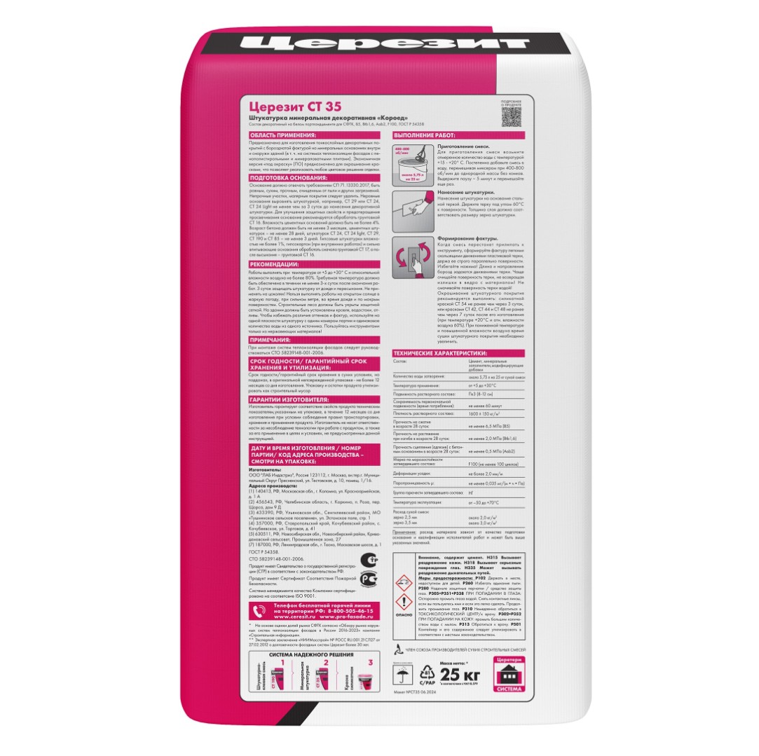 CT 35 – это марка качественной штукатурной смеси, разработанной для создания декоративных тонкослойных покрытий. Отделка имеет бороздчатую фактуру. Эта штукатурка используется при работе на цементных, бетонных, гипсовых, древесностружечных и гипсокартонных основаниях. Применяется, как покрытие внутри и снаружи строений и рекомендована при устройстве теплоизоляционных систем Ceresit VWS и Ceresit WM. Обеспечивает прочное сцепление с минераловатными и пенополистирольными плитами.